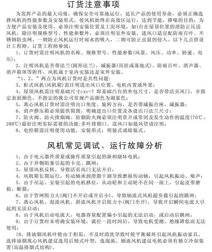 一、風機選用參考、安裝維護使用說明、常見故障分析、訂貨注意事項